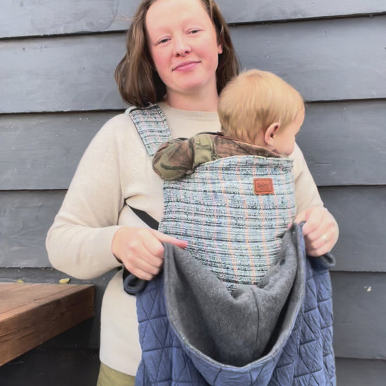 Cozy double layered carrier cover to keep your little one warm while babywearing. A must have winter accessory for adventures and everyday outings with your baby or toddler during the cold weather. Our original line of carrier covers, the basic collection features covers with a soft knit exterior and fluffy fleece on the inside.